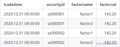 - 因子的存储方式是单值纵表方式还是多值宽表方式。 单值方式的最大优点是灵活性强,增加因子和股票时,不用修改表结构,缺点是数据冗余度高。多值宽表的数据冗余度很低,配合TSDB引擎的array vector,存储效率很高,但是新因子或新股票的出现,需要重新生成因子表。