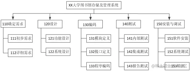 - 工作分解结构(WBS)把项目可交付成果和项目工作分解成较小的,更易于管理的组成部分。实例如下: