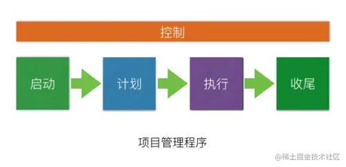 项目管理程序可以分为下图5个流程,启动->计划->执行->控制->收尾。