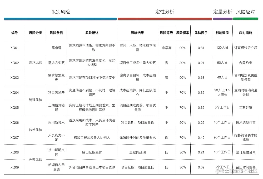 有效的避免和应对风险是项目顺利完成的前提保障。风险管理有以下流程:规划风险,识别风险,定性分析,定量分析,风险应对,风险监控。