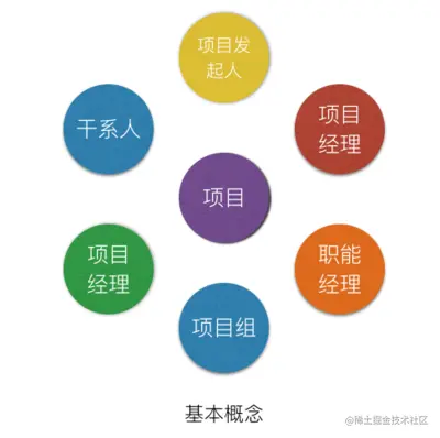 普及下项目相关的基本概念,如下图,有项目发起人、项目经理、职能经理、项目组、项目经理、干系人、项目等基本概念。