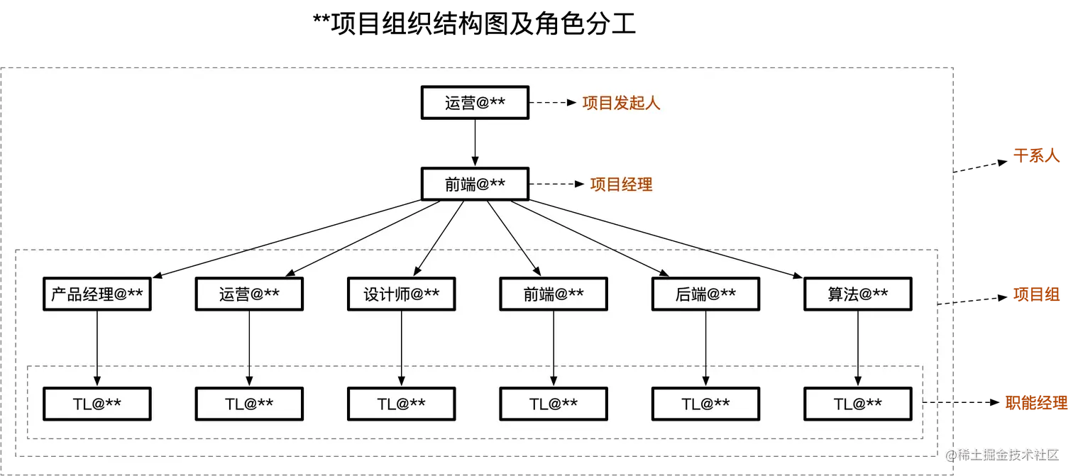 以某前端主导项目为例,项目组织结构图和角色分工如下。