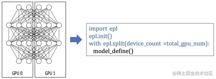 - 算子拆分并行:在以下例子中,EPL会对split scope下的模型定义做拆分,并放置在不同的GPU卡上做并行计算。