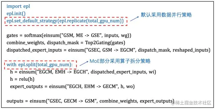 EPL中提供简洁易用的接口来进行模型的混合并行训练,只需要增加几行annotation来配置并行策略,模型本身不需要任何修改。例如,M6模型采用数据并行+专家并行的策略,只需要增加如下图的annotation: