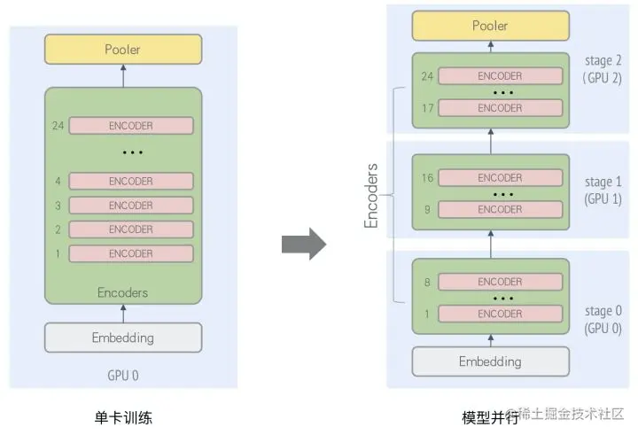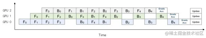此时每张卡训练时的显存开销会减少,从而可以增大batch size以提升收敛加速。另外,对于模型过大单卡显存无法放下导致无法训练的场景,通过Layer间拆分的模型并行方式来进行分布式训练。通过epl.replicate接口可以实现模型的stage划分,同时通过流水并行的执行调度来提升并行化性能,如下图所示: