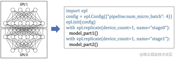 - 流水并行:在下面的例子里,模型被切分成2个 TaskGraph, "stage0"和"stage1",用户可以通过配置pipeline.num_micro_batch参数来设定pipeline的micro batch数量。 在这个例子里,"stage_0"和"stage_1"组成一个模型副本,共需要2张GPU卡。如果用户申请了8张卡,EPL会自动在pipeline外嵌套一层并行度为4的数据并行(4个pipeline副本并行执行)。