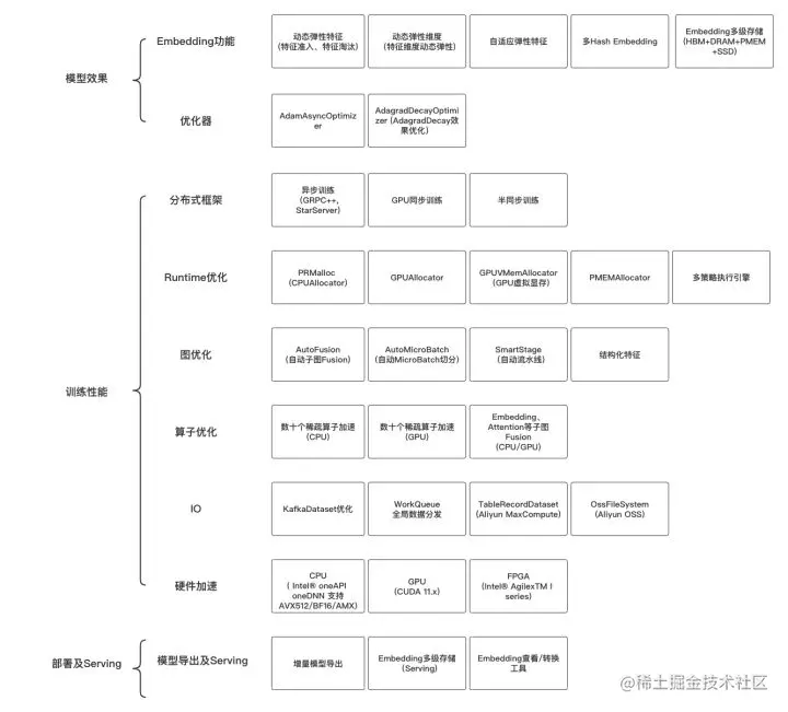 DeepRec在分布式、图优化、算子、Runtime等方面对稀疏模型进行了深度性能优化,同时提供了稀疏场景下特有的Embedding相关功能。