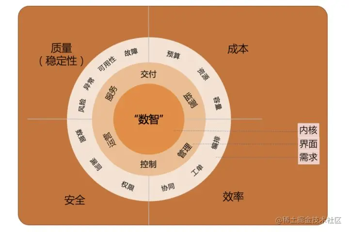 回归到运维领域的需求,无论上层产品和业务形态怎么变化,运维本质上解决的还是“质量、成本、效率、安全”相关需求。SREWorks 用一个运维 SaaS 应用界面来支撑上述需求,同时以“数智”思想为内核驱动 SaaS 能力,具体包括交付、监测、管理、控制、运营、服务六部分。