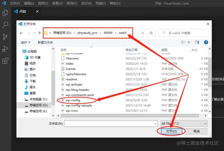 在弹出的文件选择框中,找到PHPstudy的安装文件夹下的WWW文件夹,进入该文件夹选取放置WordPress的文件夹(这个例子中为我们本地网站的文件路径,具体的路径需要根据PHPstudy的实际安装位置进行),选取web3文件夹中的“wp-config.php”文件。