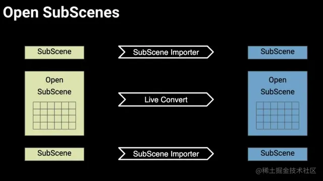利用Unity多场景的功能,首先将一个非常大的场景分成若干个小场景,Unity会将每个子场景全都转成Entity实体,这样就可以根据角色当前的位置来加载对应场景块,在游戏例子部分我也提供了类似场景切换的游戏Demo。