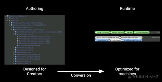 如下图所示,转换的原理就是将原本的游戏对象和身上挂的组件删掉,将它们转成实体对象和实体组件。