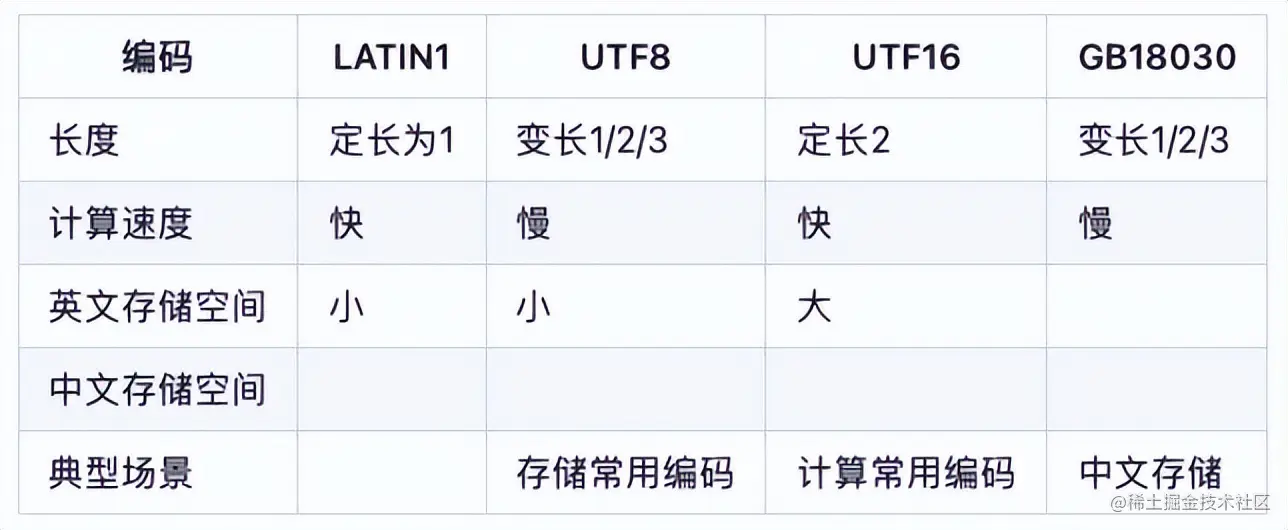 - UTF-8 变长字节编码,一个字符需要使用1个、2个或者3个byte表示。由于中文通常需要3个字节表示,中文场景UTF-8编码通常需要更多的空间,替代的方案是GBK/GB2312/GB18030。