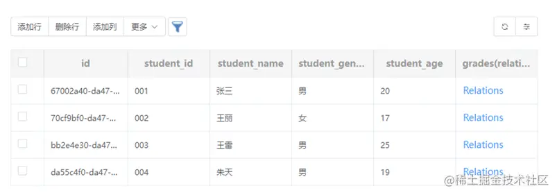 这是我们想看张三的成绩,只要点一下张三后面的Relations,就自动跳转到学生成绩表中,并且自动筛选出张三的信息了。