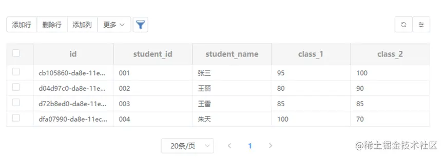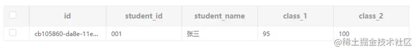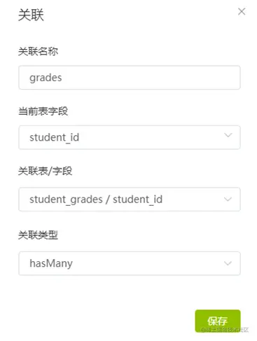 此外还有关联功能,为了演示关联功能,我们再创建一张学生成绩表,字段有默认主键id,学生编号student_id,学生姓名student_name课程1的成绩class_1和课程2的成绩class_2。