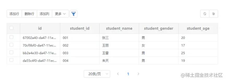 再点击添加行,设计添加几条学生信息,这样一张简易的学生信息表就建好了。