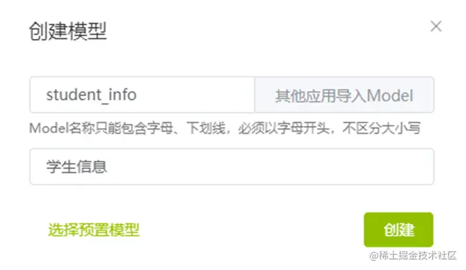 然后点击左侧导航栏的数据模型,就可以进入数据库页面了,现在我们介绍一下如何创建一张数据表,点击左下方的创建Model就相当于创建一张数据表,然后我们给这张表起一个名字student,设置数据类型为String,确认之后就可以看到左侧列表中成功增加了一张student表了。