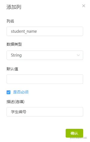 然后点击添加列,添加了学生编号student_id 和 学生姓名student_name以及学生年龄student_age和学生性别student_gender,添加列时,数据类型选择String就好,意思是这列数据都是以String类型来存储的。如果我们在是否必须上面打钩,那么当添加一行信息的时候,这个字段下就必须要有数据,如果没有值的话,就无法添加,这时也可以为这个字段设置一个默认值,如果不主动填写的话,就会自动补充上去默认值。是否必须的功能可以根据这个字段在数据中的重要程度来判断是否应该设置。在这里我们就选择id和姓名都不能为空,且不设置默认值,性别和年龄可以暂且不选择。