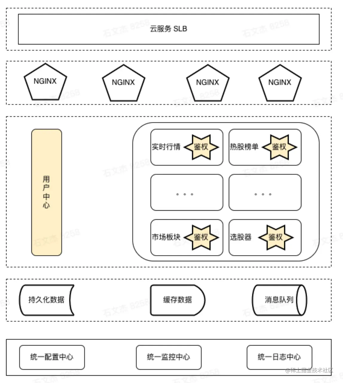 上图是雪球单机房时期的简单架构描述,用户流量从云端入口( SLB )进来后,经网关做简单的公共性逻辑后,向后端服务转发。后端服务会通过 SDK 方式集成在服务中的鉴权模块向雪球用户中心发起用户鉴权,通过后进入后续业务处理流程。