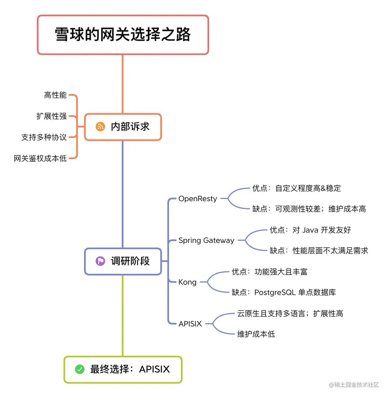 基于在业务实践场景中逐渐显现的痛点,雪球基础设施团队开始了针对网关产品的调研。通过内部诉求和目前市场中网关产品的对比,最终选择了基于 Apache APISIX 进行后续架构的调整与使用。