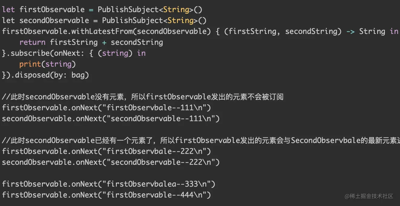 - combineLatest 操作符,当多个 Observables 中任何一个发出一个元素,如果其他 Observables 都已经存在元素的话,就会通过一个函数进行组合,然后发出一个元素
