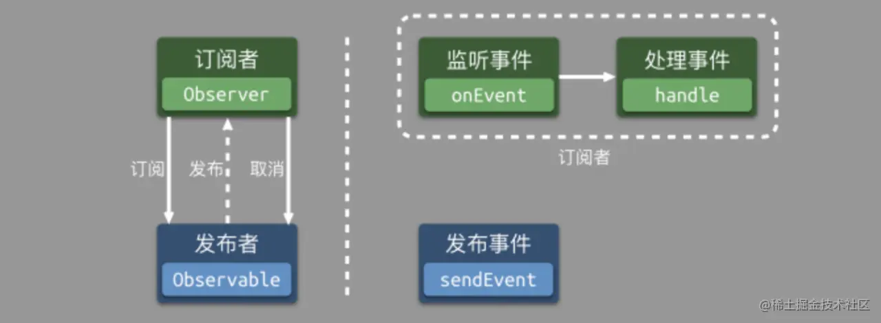 - 当发布者发布事件时,会遍历订阅者列表,执行其中的处理方法(将事件作为参数传递给闭包,并执行)。
