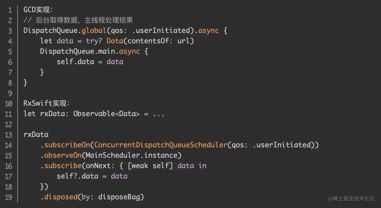 - 一个比较典型的例子就是,在后台发起网络请求,然后解析数据,最后在主线程刷新页面。你就可以先用 subscribeOn 切到后台去发送请求并解析数据,最后用 observeOn 切换到主线程更新页面,如下所示: