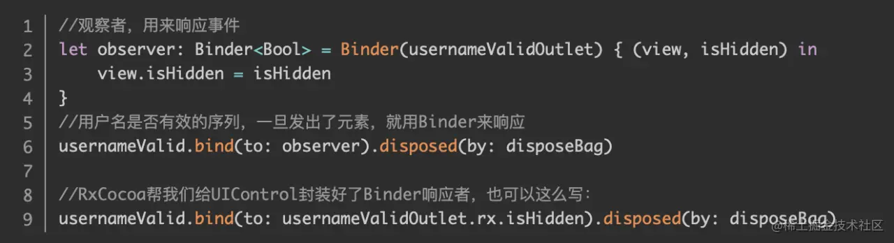 - Binder 观察者不会处理错误事件,并且确保响应都在给定的 Scheduler 上执行,默认是 MainScheduler,拥有这些特性它天生就是一个UI观察者,所以对 UI 序列的观察首选就是 Binder,例如:接收到用户名是否有效的序列的元素时,就可以用 Binder 作为响应者,如下图所示: