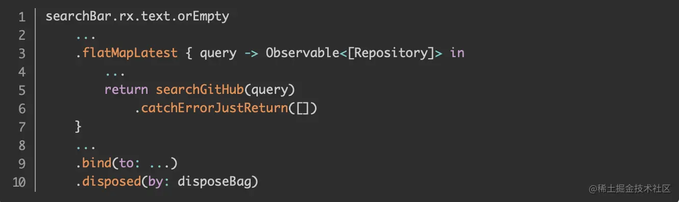 - catchErrorJustReturn 操作符将一个 error 事件替换成其他元素,并且结束该序列,如下所示:
