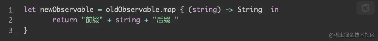 - map 操作符,通过一个转换函数,将 Observable 里面的每个元素都转换一遍,转换函数的闭包返回的是具体的类型,如下所示: