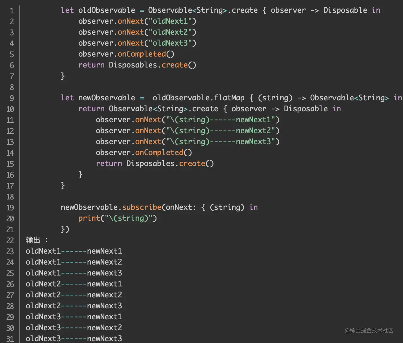 - flatMap 操作符,通过一个转换函数,将 Observable 序列里面的每个元素都转换成一个 Observable 序列,然后将这些序列合并,这个操作符可以将子序列的元素一次性全部发出来