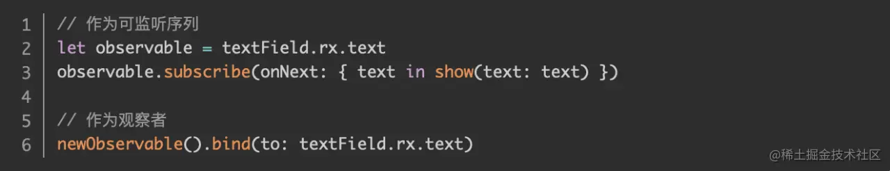 5.有一种特殊的序列,既可以是序列,又可以是观察者,例如:textField 的 text 属性,既可以看由用户输入而产生的序列,又可以看做显示内容的观察者,如下所示:
