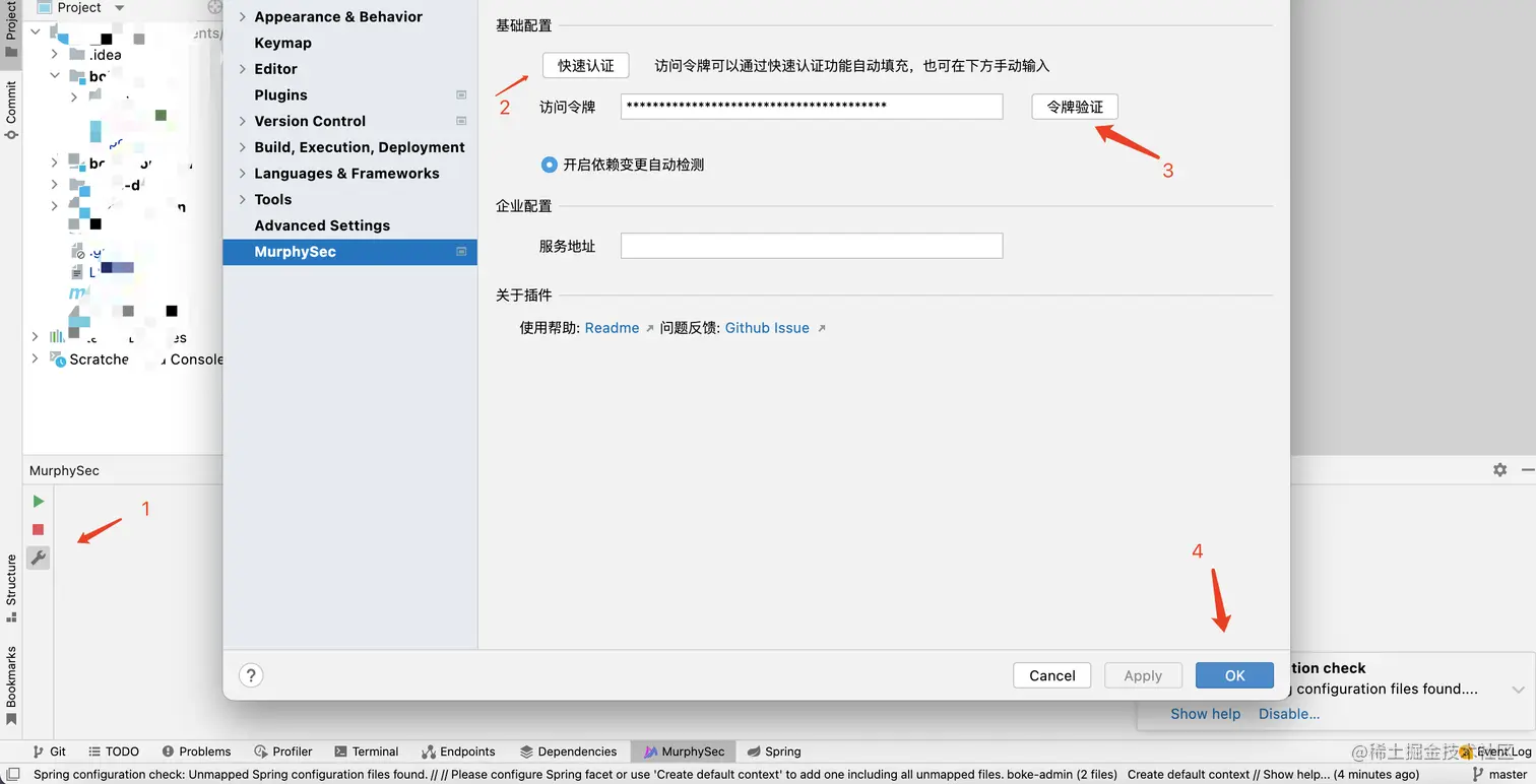 认证:在底部打开 “murphysec” -> 点击“配置” ->“快速认证”跳转墨菲控制台进行认证 -> 获取到Token后点击 “令牌验证”。