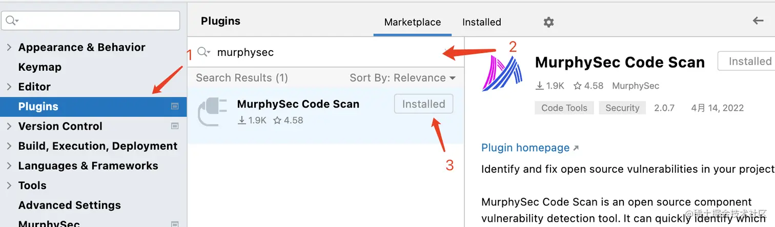 安装:IntelliJ IDEA -> Preferences -> plugins -> murphysec -> install 。