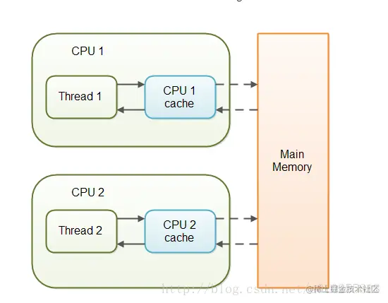 当对非volatile变量进行读写的时候,每个线程先从主内存拷贝变量到CPU缓存中,如果计算机有多个CPU,每个线程可能在不同的CPU上被处理,这意味着每个线程可以拷贝到不同的CPU cache中。volatile变量不会被缓存在寄存器或者对其他处理器不可见的地方,保证了每次读写变量都从主内存中读,跳过CPU cache这一步。当一个线程修改了这个变量的值,新值对于其他线程是立即得知的。
