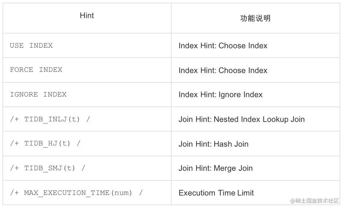 当优化器选择了非预期或不优的执行计划,用户需要使用 Hint 进行执行计划的调整。TiDB 兼容了 MySQL 的 USE INDEX,FORCE INDEX,IGNORE INDEX 语法,同时开发了 TiDB 自身的 Optimizer Hints 语法,它基于 MySQL 5.7 中介绍的类似 comment 的语法,例如 /+ TIDB_XX(t1, t2) / 。下面是 TiDB 目前支持的 Hint 语法列表: