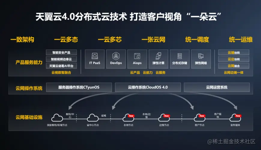 2021年11月,天翼云发布了4.0分布式云,实现了一云多态、一云多芯、一张云网、一致架构、统一调度、统一运维。产品与技术的升级,带来天翼云算力、存储、网络的全面提升。