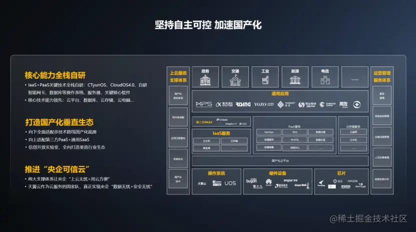 作为云服务的“国家队”,天翼云走过十年科技创新之路,完成了从过去商业系统到自研系统的转变,形成资源布局和自研产品能力双优势。天翼云始终坚持IaaS+PaaS关键技术全栈自研,包括定制化的宿主机操作系统CTyunOS、云操作系统CloudOS4.0、自研智能网卡、数据库等关键核心技术和软件。同时在云服务细分领域打造国产化垂直生态,担起算力国产化发展的责任,推进企业上云,帮助行业用户实现数据无忧、安全无忧。