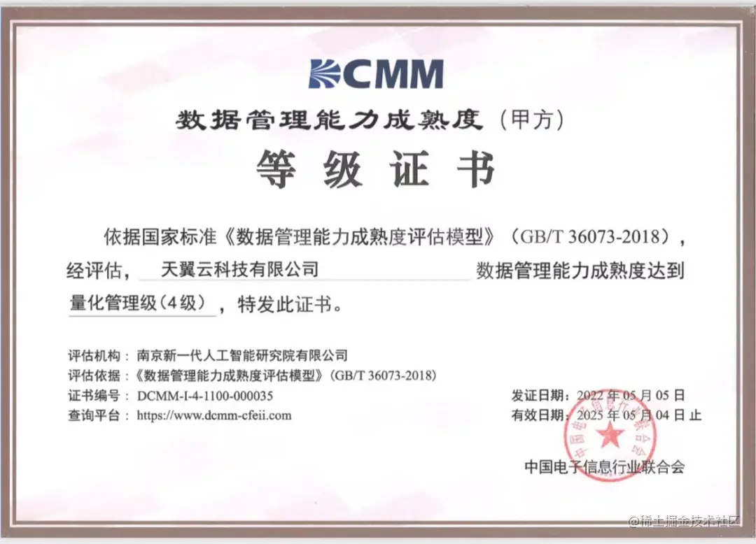 近日,中国电子信息行业联合会(简称“CFEII”)公布了2022年第二批获得DCMM(数据管理能力成熟度)等级证书的企业名单,天翼云科技有限公司获评DCMM 4级,数据管理能力达到量化管理水平。
