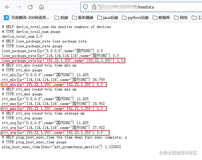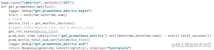 1、这里写了一个prometheus拉取数据的接口,device_list这里获取到三个ip,分别是8.8.8.8、114.114.114.114、192.22.1.250。get_rtt_state()方法是执行ping操作。
