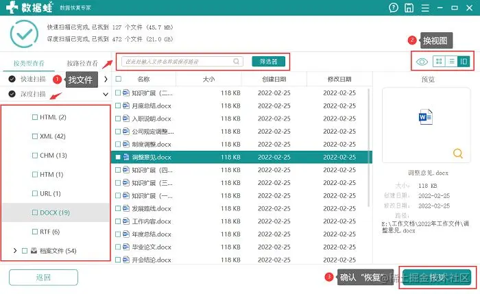 恢复操作:待扫描完成后,在左侧的扫描结果中找到自己需要恢复的文件类型,随后点击“恢复”即可!