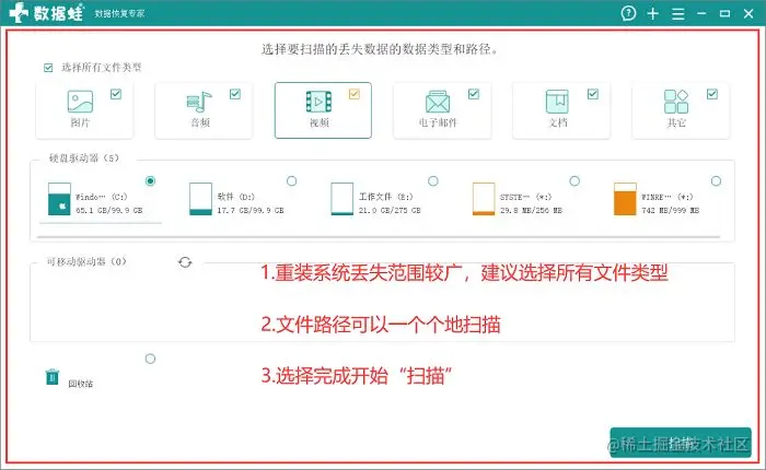 主要操作:在电脑内运行数据蛙数据恢复专家后(www.shujuwa.net/shujuhuifu/ ),首页选择好自己丢失的文件类型以及文件位置(重装系统丢失范围较广,文件类型建议全选,文件路径建议一个个扫描,避免遗漏),选择完成后开始“扫描”;