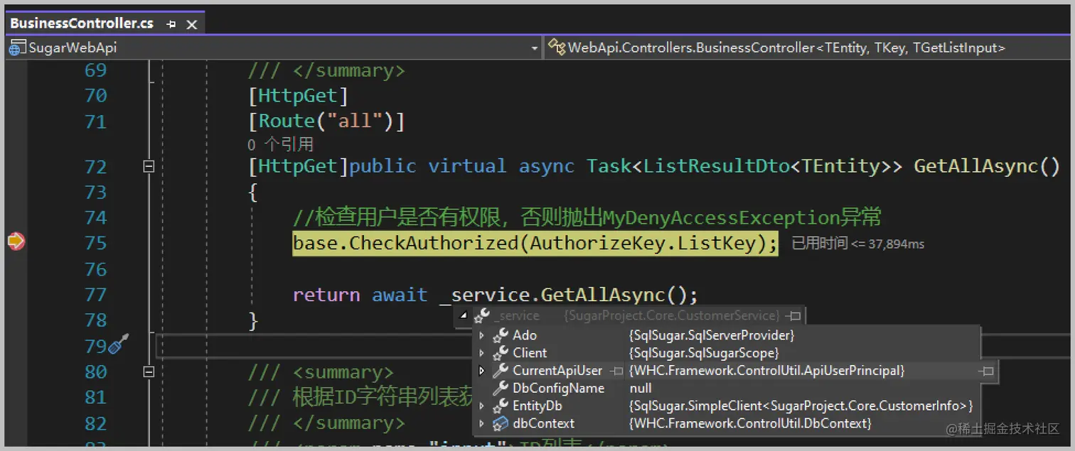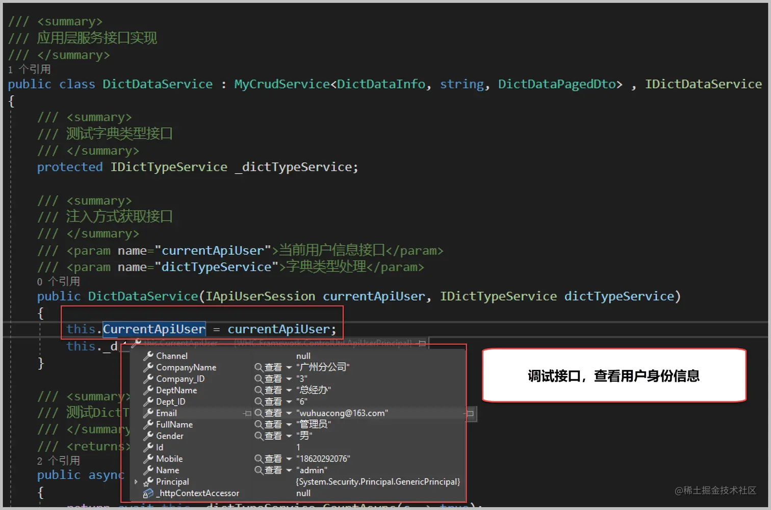 在最底层的操作基类中,我们就已经注入了用户身份信息,这样我们不管操作任何函数处理,都可以通过该用户身份信息接口CurrentApiUser获得对应的用户属性信息了。