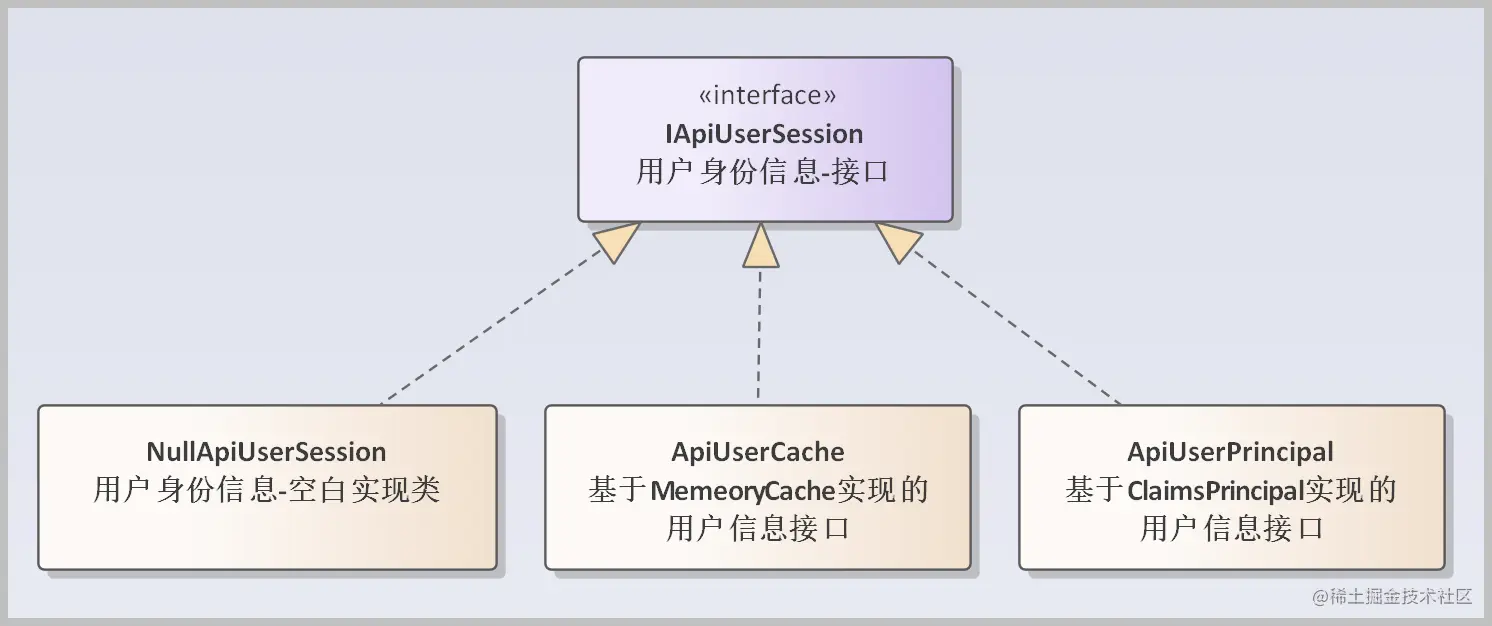 由于这个用户身份信息的接口,我们提供给基类进行使用的,默认我们在基类定义一个接口对象,并通过提供默认的NullApiUserSession实现,便于引用对应的身份属性信息。