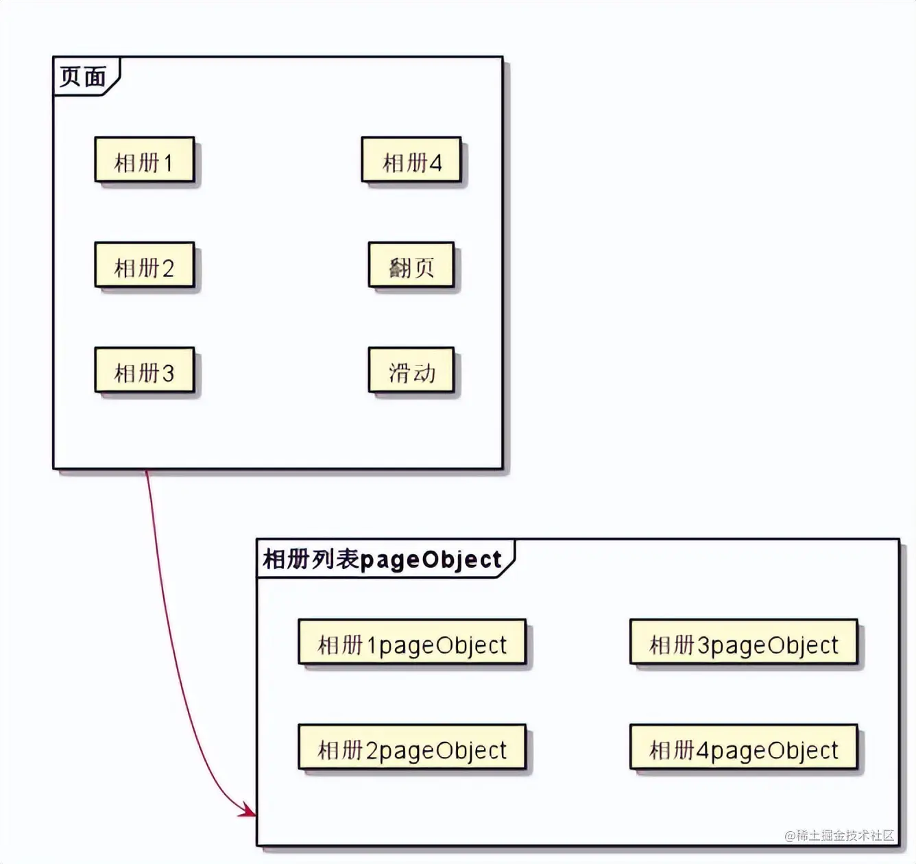 比如,一个页面显示多个相册,应该创建一个相册列表page object,它包含许多相册page object。如果某些复杂UI的层次结构只是用来组织UI,那么它就不应该出现在page object中。page object的目的是通过给页面建模,从而对应用程序的使用者变得有意义: