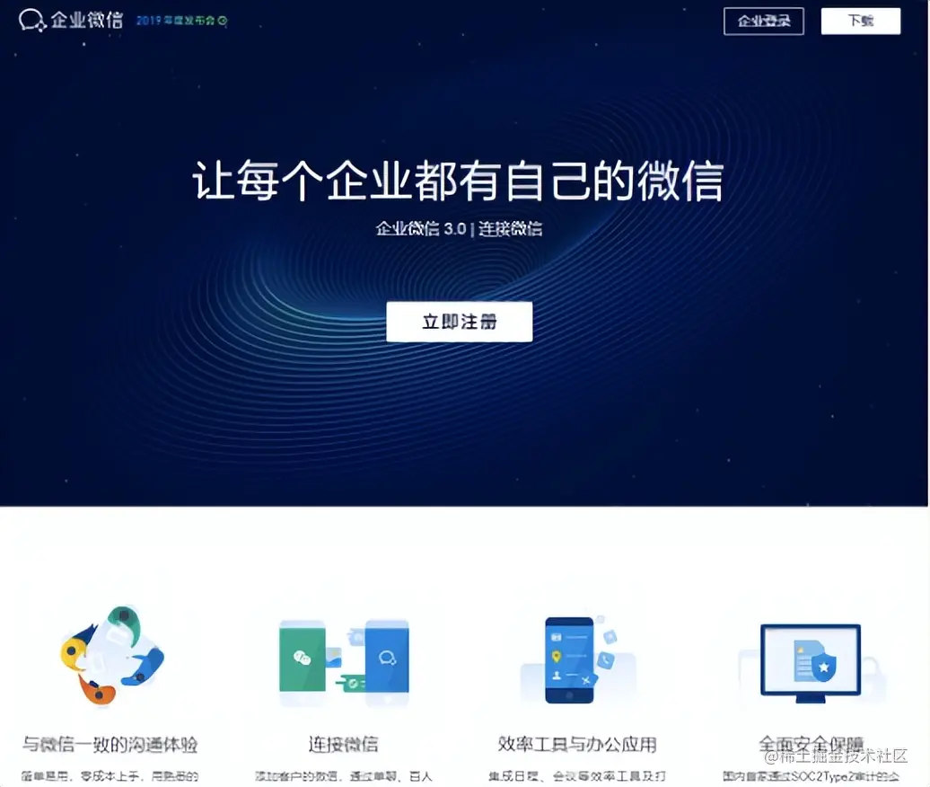 以企业微信首页为例,企业微信首页有二个主要功能:立即注册和企业登录。