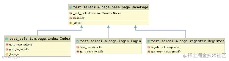 Index是企业微信首页的page object,它存在两个方法,进入注册page object和进入登录page object,这里return方法返回page object实现了页面跳转,比如:goto_register方法return Register,实现从首页跳转到注册页: