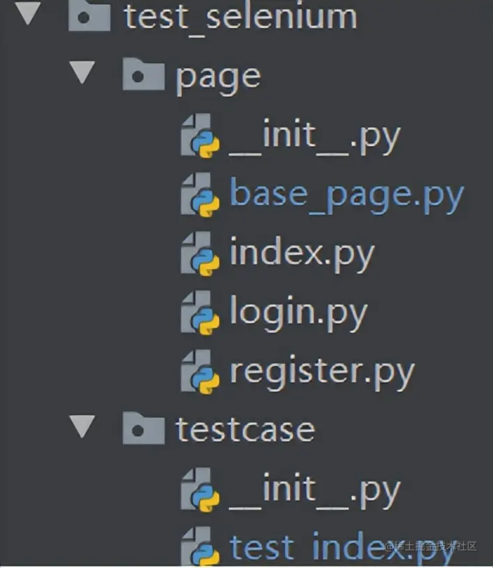 test_index模块是对上述功能的测试,它独立于page类,在TestIndex类中只需要调用page类提供的方法即可,比如下面对注册页及登陆页的测试使用了test_register和test_login方法: