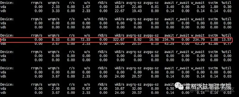 比如,对于上图来说,要理解的计数器就是 await 和 svctm,await 高是肯定存在问题。如果要判断问题是严重不严重还要看另一个计数器就是 avgqu-sz,它是队列长度。svctm 是平均每次 io 的时间(单位:ms)。