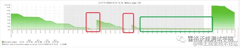 那么上面是不是说内存没有问题呢?当然不是。因为内存不仅被用光了,而且还断了一段,后面又有了数据,接着又用光,又断了一段时间。红色的框中,是有问题的,因为这一段连数据都没有抓到,抓数据的进程应该是没了。