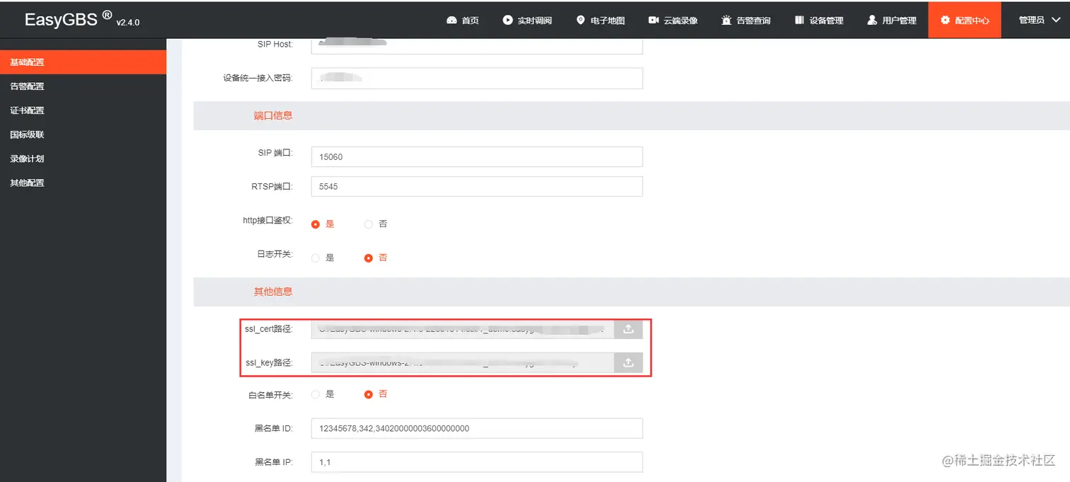 有用户反馈,登录EasyGBS平台,在配置中心配置了证书,如下图: